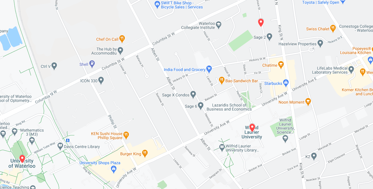 325 Spruce St. Student Residence is conveniently located near universities and colleges, as well as shopping, restaurants, and public transportation. Our building is just a 13-minute walk from Wilfrid Laurier University, a 15-minute walk from Conestoga College, and a 24-minute walk from Waterloo University.